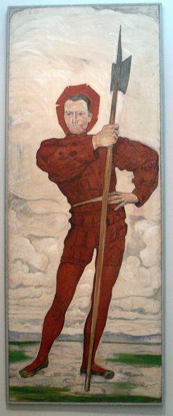 Editor: This is "Wounded Soldier," a painting by Niko Pirosmani. While the date isn't listed, its simplified form and somewhat unsettling stare really grab me. What strikes you most about this piece? Curator: The symbolism, without a doubt. Look at the wounded foot, bound yet still bleeding. This is not just a physical wound, is it? It's the mark of sacrifice, of a burden carried, maybe even a fallen empire. Notice how his eyes seem to look beyond us, a hollow stare that speaks volumes about the emotional cost of conflict. Does this figure evoke feelings of nostalgia? Editor: Nostalgia, perhaps tinged with something darker. He appears more defeated than heroic, if that makes sense. His clothes are dishevelled. It does speak to sacrifice, definitely. Curator: Consider the gun he holds, an almost archaic weapon. The artist links personal suffering and cultural anxieties of his time with symbols from the past. Does the stiffness of the pose appear strange? This rigidity mirrors something internal and profound, the petrified horror of having witnessed brutality perhaps. Editor: Yes, there's a strange disconnect between the almost cartoonish rendering and the serious subject matter. The artist has flattened his face and presented this blank stare as a cultural memory and even historical truth? Curator: Precisely! Pirosmani captured complex emotions through seemingly naive forms. Consider the historical period, the early 20th century in Georgia, marked by conflict and upheaval. He translates those tumultuous times into something that feels eternally human, using easily decipherable symbols. So this invites contemplation about shared experiences across time and cultural barriers. How powerful that his simple presentation allows access! Editor: I see that now; there's more depth here than initially meets the eye. What began as caricature became complex and more serious by your revealing historical, social, psychological truths that exist just under the surface of things. Curator: Exactly. And that, perhaps, is where the true power of the work resides—its capacity to awaken buried cultural memories and reveal deeper emotional truths.