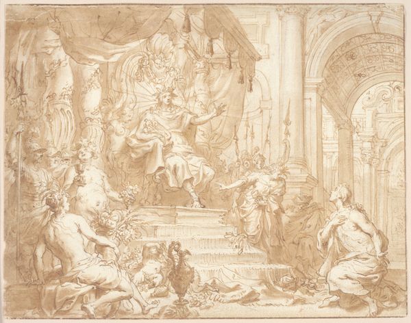 Curator: This drawing, housed here at the SMK, is entitled "Reclining Nymph in a Garden with Fountain, Vase, and Three Cupids" by Bartolomeo Biscaino, dating back to between 1632 and 1657. Editor: It's rendered in a warm sanguine wash; everything seems bathed in terracotta light, a very dreamlike atmosphere. The nymph seems lost in her thoughts and surrounded by what looks like some fabric and a lot of putti! Curator: Yes, and considering Biscaino's influences, the scene invites interpretation within the framework of the baroque era, where art was often didactic. The nymph embodies feminine virtue and divine grace, whilst her repose echoes both power and vulnerability. The cupids serve to elevate her status as an allegorical figure and amplify the thematic richness. Editor: What's striking is the material rendering. The way the red chalk creates the varied textures – the smoothness of the nymph’s skin juxtaposed with the rough-hewn garden, plus all those classical ornamentations, it showcases Biscaino’s keen observational abilities. What I would love to understand more is the labor behind creating these fine materials, as it underscores larger class divisions. Curator: Exactly, and in dissecting the material circumstances under which this drawing was produced, we also consider who its intended audience would have been, for example, as part of a printmaking process. How does such material access inform the narrative power embedded in the work, particularly for female viewers? Editor: Yes! And furthermore, do we know where he sourced the sanguine chalk and did its particular color offer more accessibility compared to other material during the period? Or how his studio impacted the materiality of this work through their unique labour input. Curator: Examining the symbolic potential allows for deeper interpretations about feminine beauty and naturalness within complex patriarchal systems. These details enrich and add greater historical depth into these visual stories. Editor: Ultimately, considering the intersectionality in class, production, labor, and gender relations in relation to how materials are sourced helps broaden Biscaino’s drawing's historical impact for the modern audience. I find this methodology to reveal layers that are oft unaddressed. Curator: And that layered approach expands Biscaino’s drawing into an ever-relevant, dynamic narrative today!