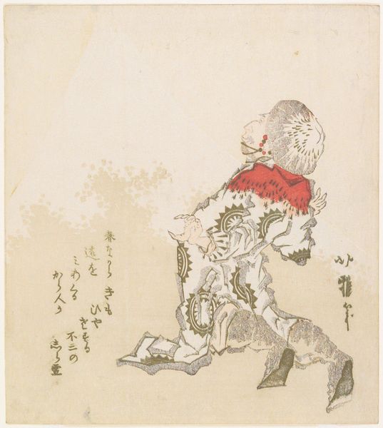 Editor: This woodblock print, "A Chinese Man Astounded at Mount Fuji" by Katsushika Hokuga, feels like a commentary on cultural exchange. The figure is clearly not Japanese, gazing at this iconic symbol. How do you interpret Hokuga's choice to depict a foreigner's reaction? Curator: It's fascinating, isn't it? Consider the historical context. Japan was opening up, encountering new perspectives. Hokuga may be exploring themes of orientalism, perhaps critiquing the Japanese gaze on the "other" even as he depicts the "other's" awe. Is it genuine wonder, or is there an element of exoticization? Editor: That's a perspective I hadn't considered. It makes the piece feel far more complex than just a scenic view. Curator: Precisely! By placing a Chinese figure at the heart of the composition, Hokuga prompts us to question whose gaze truly defines the value and meaning of cultural icons like Mount Fuji. Editor: Thank you, seeing it that way really changes how I read the whole piece.