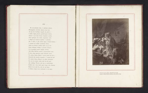 Editor: This is a photo reproduction of an illustration by Thomas Stothard for John Bunyan’s "The Pilgrim's Progress," dated before 1881. It’s a lithograph, etching, and print all rolled into one. The oval shape containing the illustration on the right page really draws the eye. What can you tell me about it? Curator: Immediately, the stark contrast within that oval commands attention. The monochromatic palette—the interplay of light and shadow—creates a structured hierarchy. Note how the figures are clustered, almost interlocking. This dense composition leads the eye upward along a deliberately structured, ascending diagonal. Editor: So, you are focusing on the structure itself...what about the thematic components? Curator: Theme arises through structured elements. Observe how the artist utilizes the frame. The oval isn't merely decorative; it confines, focusing our attention and intensifying the visual weight within. Are you seeing how Stothard's work here presents us with an image about the narrative itself through a set of highly intentional structural devices? Editor: I see what you mean. The oval focuses the scene. The details, like the shadows suggesting the incline, or the groupings, it's all carefully designed. Curator: Precisely. It’s a testament to how formal elements can elevate narrative, leading to complex interplays of structure and content. Editor: That's fascinating, I will remember this going forward!