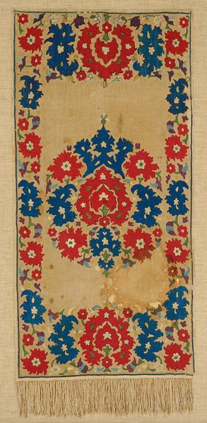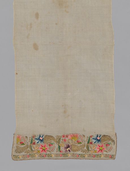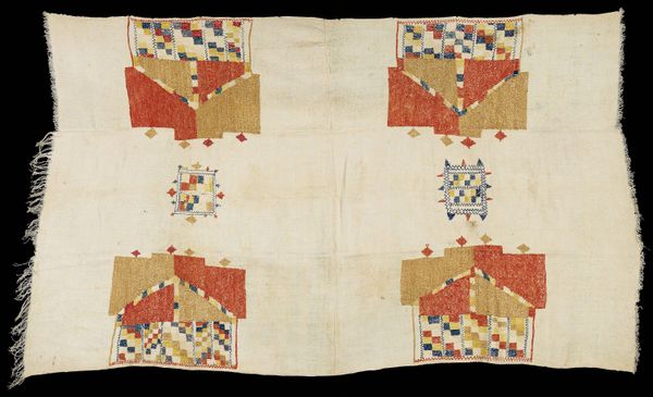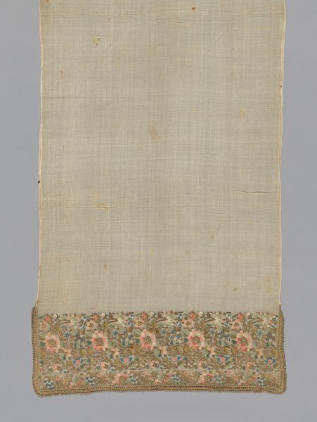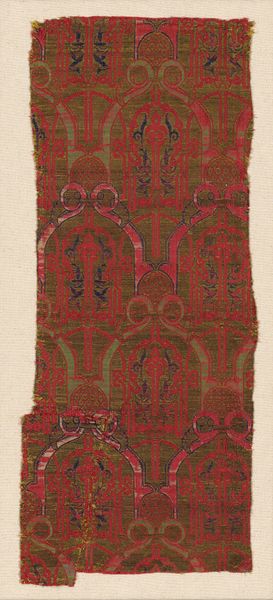 Curator: Let’s turn our attention to this remarkable textile fragment, identified as originating from a tunic dating back to the Roman and Arab periods, specifically the 6th and 7th centuries. Editor: It has this understated, calming effect... The palette is muted, almost whispers of red and green on a creamy ground. Makes you want to touch it, even through the glass. Curator: Absolutely, and the artistry is deeply rooted in Coptic traditions. We see repeating stylized vegetal motifs— suggesting perhaps lotus flowers or abstracted palmettes – rendered with meticulous care. Notice the borders framing these vertical panels. Editor: I'm curious about the production of something like this. Was this something made in a workshop, or could this have been created by someone for personal use? Was it perhaps even bartered for something? Curator: A fantastic point! The consistent pattern suggests a degree of specialized skill, but it's within the realm of possibility that it was produced in a domestic setting as many homes had looms. Either way, someone poured their time into carefully selecting the yarns and precisely interlacing warp and weft, creating these resilient patterns. This wasn't a trivial task. Editor: The thing I love most about working with textiles, particularly those of ancient vintage like this one, is thinking about what that original labour might tell us. Here is someone weaving the hopes and beliefs of their day, threading bits of history through every colour choice. You know, I have to admit, though, seeing it here... preserved under glass… it’s sad in a way. A part of a whole divorced from its purpose. Curator: That fragmentation also echoes our fragmented understanding of the world it came from. We glimpse a bit of their art through this small segment and are inspired to reconstruct and imagine. Though this piece may now be held within the formal setting of a museum collection, its humble past and rich historical legacy endures in the threads.