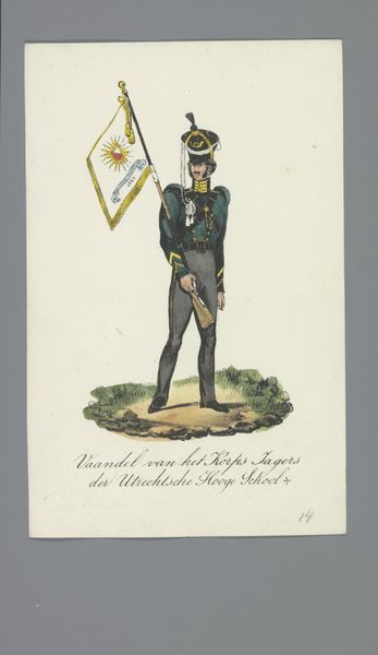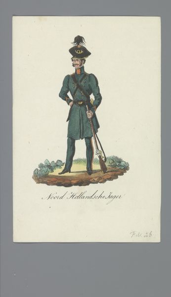 Curator: Here we have "Soldaat van het 2 Batt. Jagers" – that translates to "Soldier of the 2nd Battalion, Riflemen"–a watercolor painting dating from around 1835 to 1850, attributed to Albertus Verhoesen. It's currently housed right here at the Rijksmuseum. Editor: My first thought is "regal." It's such a simple composition, just one figure, but there's something very proud and almost romantic in his stance and expression. It is what makes the work stand out for me. Curator: Verhoesen made quite a name for himself specializing in military scenes, particularly cavalry battles and soldiers. His art was shown and sold throughout the Netherlands and he became well-known for this niche in Academic and Romantic Art. This painting reflects both of those movements, doesn’t it? Editor: Absolutely, though it raises questions for me. How does a seemingly objective representation of a soldier, which in and of itself presents specific cultural roles that were accepted at that time in society, engage with ideas about masculinity and power structures of that era, when warfare often reinforced dominant societal norms. Curator: A fascinating point, especially if we consider the Dutch colonial context. Such pieces would likely have served to inspire the public confidence in the military at that time and promote patriotic feelings that often served a purpose during that era, given all the political upheavals and struggles across Europe and beyond. Editor: And isn't there something unsettling about that? I can’t help but read this work as propaganda—the romanticization of military force normalized violence and colonization, particularly through portraiture as we know. What stories are *not* being told, here? Who is rendered invisible? Curator: That critical lens is so vital for re-framing our perspective on these artworks from history. By understanding them through both technique, artistry, and historical context along with modern theory, we gain deeper insight and that’s important! Editor: I agree completely. Analyzing Verhoesen’s "Soldaat van het 2 Batt. Jagers" allows us to see not just the artwork, but the stories that artworks suppress and those that rise to prominence. It allows us to consider those in conjunction with one another to understand not only how an image can create an impact in culture, but its many roles and reasons behind that purpose as well.