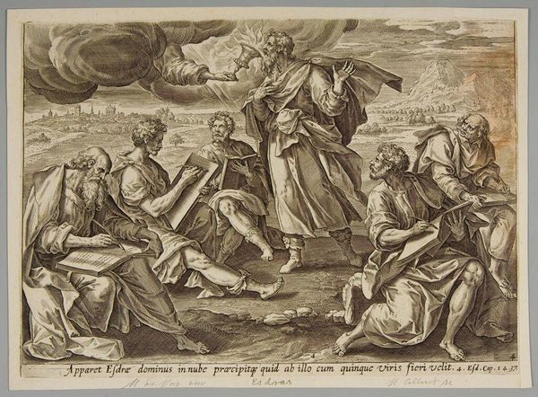Curator: Let’s discuss "Cloelia Flees the Camp of King Porsenna" by Giuseppe Niccolò Vicentino, currently held in the Harvard Art Museums. Editor: It strikes me immediately as a dramatic composition, almost theatrical with its staged groupings and dynamic movement. Curator: Absolutely, and considering the context of the Roman Republic, Cloelia's actions were exceptionally brave, challenging patriarchal norms by escaping captivity and then leading other female hostages to safety. Editor: The use of chiaroscuro is remarkable; look how the light emphasizes her figure, imbuing her with agency and highlighting the composition's structure. Curator: Indeed, her resistance to domination is a theme that resonates powerfully, given ongoing global struggles against oppression and for bodily autonomy. Editor: Agreed, and the flowing lines contribute to the overall sense of motion, almost carrying the viewer along with Cloelia and her companions. Curator: It's a compelling example of art as a narrative of resistance. Editor: And a fascinating study in contrasts and compositional balance.