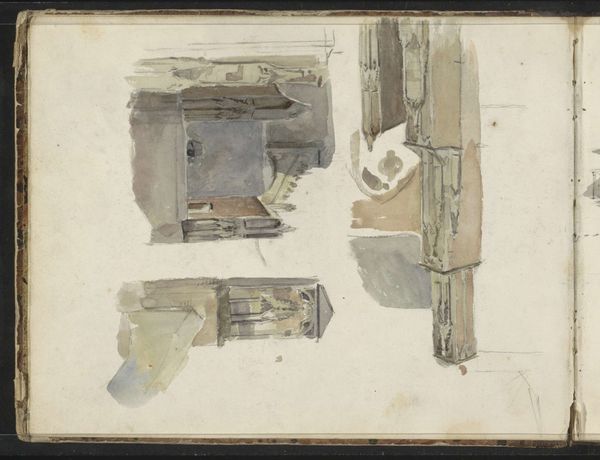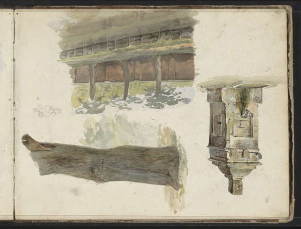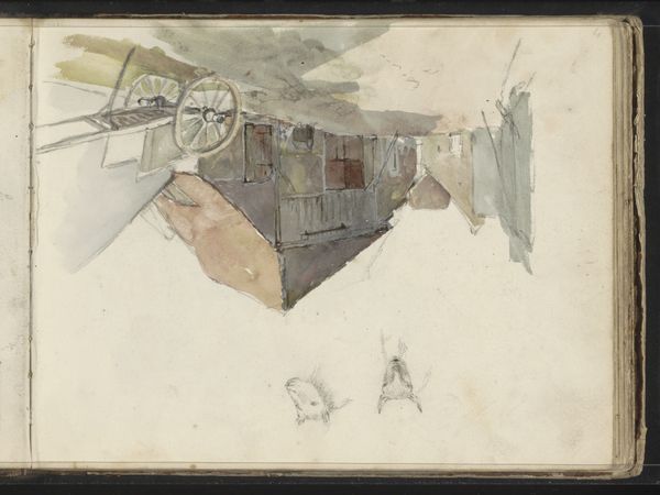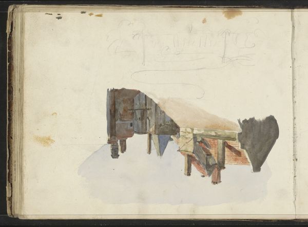 Curator: Welcome. We're looking at Willem (II) Troost's "Boerderijen," a watercolor and colored pencil work, dating roughly from 1822 to 1893. It's currently held in the collection of the Rijksmuseum. Editor: My first impression is of something sketched quickly, perhaps outdoors. There's a certain raw, immediate quality to the light washes. You can almost feel the dampness in the air. Curator: Absolutely. I think the visible layering of washes, typical of the watercolor medium, adds to that sense of atmospheric perspective. Look at the placement of the houses – the higher one seems to echo the lower, almost mirroring it. I find myself searching for the symbolism implicit in the reflection or repetition of simple forms. Editor: It’s more than simple echoing for me, I think it exposes how provisional everything is: look how much unpainted paper remains. Notice the marks from the colored pencil indicating structure? It looks like the roof and windows are given shape using only basic angular elements to support the planes and shapes of each construction. And observe that the materials are humble, affordable. I would suggest the choice of subject matter is just a quick sketch—more accessible. Not so burdened with classical ideals. Curator: A quick study, perhaps, but even so, one still finds echoes of familiar themes within the artistic record, particularly Dutch art history. Aren't you intrigued by the contrast between the vulnerability suggested by the open windows and doors and the stability conveyed by the solid geometry of each house? The human element, even absent, speaks volumes. Editor: But is it really stable? To my eyes it reads less as permanent solidity and more a study of modest constructions created in the moment with few materials to hand. This feels quite democratic to me – elevating everyday life through the artist’s careful considerations of the texture of the buildings and the play of light upon them, and done in a cheap manner, for us. Curator: And now you point it out I note its very much lacking humans; maybe these farms have become shells of themselves? It really lends itself to a contemporary reading when viewing its materiality and simplicity alongside its setting… almost a comment on sustainability for that time? It makes one wonder what memories might attach themselves to the structures represented within it over the centuries? Editor: Indeed. So much we don’t know that is provoked in viewing this painting...