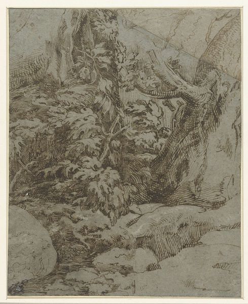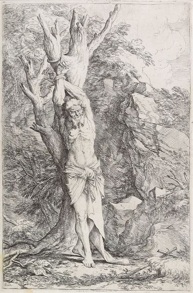 Curator: Look at this delicate etching, "Discovery of the Bodies of Saint Peter and Saint Paul," crafted by Giovanni Benedetto Castiglione, also known as Il Grechetto, sometime between 1647 and 1751. It's currently held at the Minneapolis Institute of Art. Editor: It's striking, almost dreamlike, the way the scene is rendered in these shades of grey. There’s a kind of ghostly pallor to the figures and a tangible solemnity hangs in the air. The lush landscape contrasting the stark figures presents quite a tension. Curator: Precisely! Castiglione was fascinated by narratives, often religious or mythological, and the interplay between light and shadow is characteristic of the Baroque style he worked within. Here, the dramatic chiaroscuro illuminates the bodies, contrasting sharply with the darker surroundings, amplifying the discovery’s significance. It plays into the theatricality prevalent in much Baroque art of this period. Editor: It definitely carries that heavy theatricality, but I'm curious about the discovery itself. Whose narrative are we centering by highlighting this finding? Were Saint Peter and Saint Paul not already venerated, and what power dynamics are at play by re-establishing their foundational presence in such a public manner? I see political undertones in this supposed religious relic. Curator: That’s a crucial observation. The Counter-Reformation certainly leaned into relics and dramatic depictions of martyrdom to solidify the Catholic Church's authority in the face of Protestant challenges. Locating their remains physically grounded their spiritual authority, bolstering institutional claims of legitimacy. Editor: So, it’s not just a simple scene; it's about claiming dominance, both religious and political. The idealized landscape is another form of artifice contributing to that same end. One almost expects angelic choirs in the heavens... were it not a black-and-white image, of course. Curator: I concur. And beyond the overt religious subject, Castiglione was known for his innovative etching techniques. Note the dynamic lines used to depict foliage. They showcase his technical virtuosity but also contribute to the scene’s overall emotional intensity. He skillfully manipulated the medium. Editor: Which adds an entirely new dimension to it, considering that printmaking opened religious imagery up to more populist viewing. These ideas around sacred leadership could, as a result, take stronger hold within a broad base. So the politics go beyond the canvas. Curator: It does provide broader access to such charged imagery. It highlights the powerful interrelation between art, religion, and the political theater of the era. Editor: Seeing it that way truly brings those dynamics to the foreground. It helps me contextualize this rediscovery as a kind of propagandistic resurrection for political purposes. Curator: Absolutely. Castiglione's "Discovery of the Bodies" gives us insight into 17th-century religious, political, and artistic discourse. Editor: It does – and I appreciate the prompt to ask questions of it!