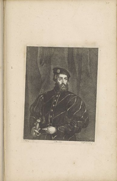 Curator: Here we have Lucas Vorsterman the Younger's "Portrait of an Unknown Man," an engraving dating to around 1660. Editor: It’s a severe image. The somber color palette and the subject's unwavering gaze create a rather imposing presence. Curator: Indeed. Vorsterman's meticulous use of line—observe the hatching and cross-hatching—articulates form and texture with precision. The composition adheres to the portrait conventions of the time, but consider how the geometric severity in the background contributes to an atmospheric sense of gravity. Editor: He certainly appears a man of substance. One wonders what his position was in society? The heavy fur and carefully delineated robe points to someone affluent. Given the rise of a Dutch mercantile class, might this be an example of art democratizing to the bourgeois? Curator: The lack of firm provenance makes specific contextual interpretation tricky, but you make a worthy point. This was an age where printed images became more widespread. Perhaps Vorsterman meant to explore new audiences. The technical skill is admirable, but the distribution says even more. Editor: It feels more accessible. The work lacks flamboyant symbolism. We can focus on the direct human impact of the subject and artist. Curator: Consider that many portraits in the baroque age were vehicles for ideology. The simple medium could act as an equalizer in cultural visibility. Editor: And, given the somber air about the image, it almost acts as an austere leveler in emotional register. It prompts some thoughts on individual human interiority beyond position and wealth. Curator: It presents us with so many interwoven perspectives when we read an image, from aesthetic technique to its place within shifting socio-political frameworks. Editor: Exactly! And these lines act as starting points for so many stories.