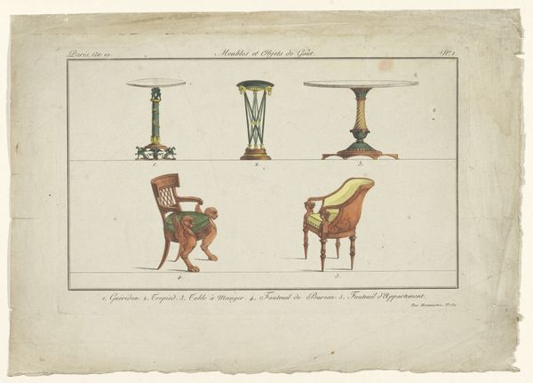 Pierre Claude Delagardette produced this design for a chair, or "Leunstoel," as it's known in the Netherlands, using etching techniques. Made in France, during the late 18th century, this drawing offers a fascinating glimpse into the design sensibilities of the era, reflecting the broader social and cultural context of the time. The chair's design, with its emphasis on elegance and comfort, speaks to the aristocratic tastes that dominated French society before the Revolution. It also shows a growing concern with ergonomic design. Delagardette's meticulous attention to detail also provides a window into the world of craftsmanship and artisanal production that flourished under the patronage of the French court. Architectural drawings and design patterns were closely regulated and circulated by institutions like the Royal Academy of Architecture. Further research into French furniture design of the period, along with archival sources such as trade catalogs and inventories, would help us better understand the context of this drawing. After all, the history of art is always contingent on a broader understanding of social and institutional context.