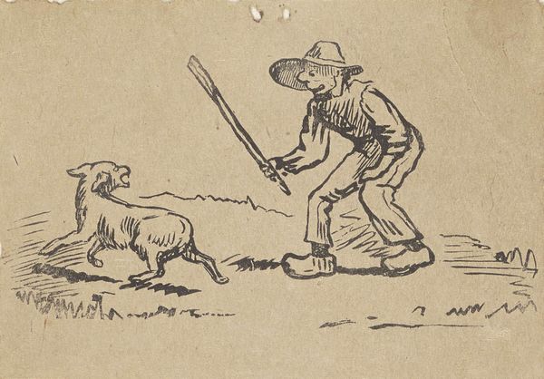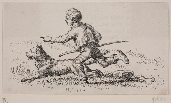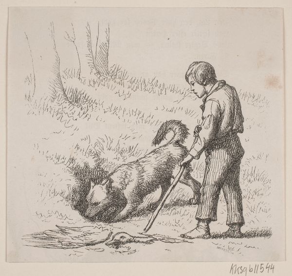 Editor: This is an illustration from 1858, entitled "Illustration til \"Hr. Mikkel\", digt af Christian Richardt." It looks like it’s a woodcut, probably on paper. It's quite small, but the level of detail is remarkable. There’s a rather unsettling mood – what do you see in it? Curator: Oh, it’s hunting, of course, with that somewhat mournful, beautiful inevitability. The scene vibrates with the hunter’s intent, focused and steady. Do you see how the light almost gathers around the fox den? It's as if the entire landscape holds its breath, watching. Editor: Yes, it is very dramatic! There's an awful lot of emotion in this seemingly simple scene. Is there something uniquely Danish about the way this hunting scene is presented? Curator: Perhaps. The Danish Romantic painters were masters of imbuing the natural world with layers of meaning, from quiet domesticity to deep spiritualism. Notice how the animals aren't simply rendered realistically, they’re full of character, even the dogs, but the landscape still feels a little flat like something from a child’s book, not alive in itself.. What do you make of that strange contrast? Editor: I guess it gives a special narrative sense, setting the stage almost, where everything will follow along the telling of a story... It makes me think of the ancient fables! Curator: Exactly! It places it in a kind of eternal present. And notice the absence of grand vistas? It is so typically Danish—turning the epic into something familiar and intimate, transforming it into a universal tale. It speaks volumes, doesn’t it? Editor: It truly does. I appreciate how it humanizes something I might have easily dismissed as a simple genre scene. Thanks for sharing your insight!