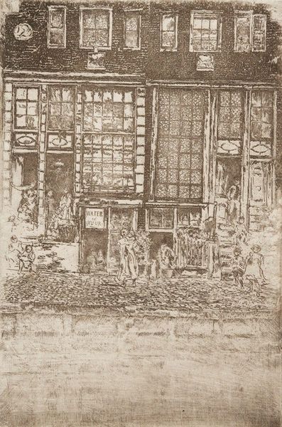 Editor: We’re looking at Joseph Pennell’s "Brasserie Lafayette," an etching from 1893. It's all in sepia tones and at first glance it feels incredibly bustling, capturing the lively energy of a busy outdoor café. The texture looks almost like it’s vibrating! What strikes you most about this piece? Curator: It vibrates, exactly! Doesn't it feel like a half-remembered dream, a fleeting Parisian moment captured in smoky hues? Pennell was a master of atmosphere. Think about what it means to capture such ephemeral feelings. It’s more than just recording what was *there*. Notice the quick, suggestive lines, how he uses light and shadow to create depth where there isn't much detail. It is Impressionism through a printmaker’s lens. Do you get that sense? Editor: Yes, definitely! It's less about precise representation and more about the *feeling* of the place. The looseness gives it that immediacy. How would a painting compare with this effect of immediacy using etching? Curator: Precisely! Etching, especially done like this, allows for a sketch-like quality – immediate, almost journalistic. Think of a painter needing to mix colours, build layers… here, Pennell could scratch and bite into the plate, directly responding to the scene before him. Wouldn't you agree this reflects a certain social energy of the era? A bit frenetic, full of possibility... Editor: Absolutely. The busyness contrasts to, say, Whistler's nocturnes. There's something more optimistic here. Curator: Optimistic is a lovely word for it! More than optimism, this little window offers me an invitation. Editor: It feels unfinished but complete. So alive. Curator: Just as life is. That’s the point! It teaches me something.