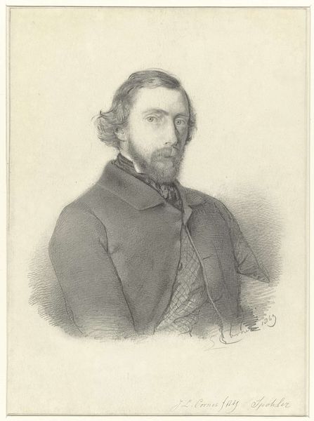 Curator: Standing before us, we have a striking pencil drawing titled “Portret van onbekende man,” or “Portrait of Unknown Man,” completed in 1852 by Elchanon Verveer. Editor: It’s quite captivating. My immediate impression is one of contained intensity. His gaze is direct, yet there’s an air of melancholy, almost world-weariness about him. Curator: That’s an astute observation. Consider how the detailed rendering, particularly around the eyes and mouth, lends itself to expressing such complex emotions. The symbolism inherent in portraits, especially in the mid-19th century, aimed to convey not just likeness but also the sitter's social standing and inner character. Editor: Absolutely. The crispness of the lines suggests a desire for precision and control, a common aim in academic art from the period. What I find particularly interesting is the slightly theatrical moustache. It feels deliberate, almost a mask. Curator: Precisely. Facial hair in that period carried significant social meaning, reflecting masculinity and status. Its careful grooming here speaks volumes, even suggesting an aspirational quality. We might even delve into how realism as a movement, heavily influencing artists like Verveer, impacted the accessibility and interpretation of portraiture. Editor: I agree. The realism here avoids idealization and this is where this 'every man' stands out in history of art full of aristocracy portraits. And that look that this “every man” shares feels strangely present, relevant even. Perhaps, because his thoughts don’t feel foreign to modern eyes, it gives me a lot to reflect upon... Curator: It's true. Through the layers of meticulous realism, we grasp something genuinely timeless and poignant about the subject and our capacity to recognise this in the present. Editor: This anonymous subject, elevated through the artist's skill, now possesses a lasting resonance beyond his lifetime.