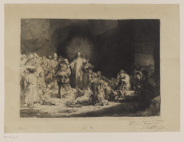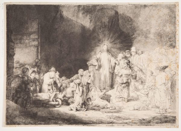 Editor: This is Rembrandt van Rijn’s "The Hundred Guilder Print," and it's just teeming with people. The use of light really draws me in; what symbols do you see at play here? Curator: Light, indeed! Notice how it radiates from Christ, illuminating not just him, but also those who seek him. It’s a potent symbol of divine grace, of enlightenment offered to a suffering humanity. The darkness Rembrandt employs is equally important. Editor: How so? Curator: The darkness represents the earthly realm, human ignorance and pain. Consider those figures cloaked in shadow; their expressions, even obscured, suggest a deep yearning, a reaching out for the light. What emotional connections do you draw from the use of Chiaroscuro in the scene? Editor: The suffering on the foreground feels highlighted by the shadow in the background! Like the whole image points toward redemption! Curator: Exactly. Consider the woman kneeling before Christ. Her posture isn’t just one of supplication; it echoes throughout art history of those seeking divine intervention, reflecting perhaps our primal human need for comfort and healing. It is fascinating how we all still resonate with these age old stories, right? Editor: Definitely! And I never would have noticed these layers of meaning just from a quick glance. It's remarkable to see how these visual symbols keep being meaningful, no matter when you see it. Curator: Precisely. The print resonates with the psychological underpinnings of faith and our deep, ongoing quest for solace.