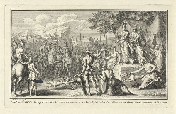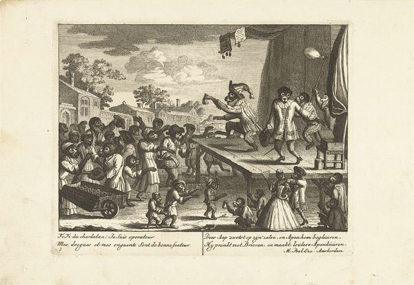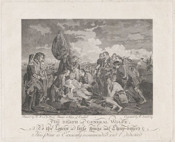 Editor: This is "The Political Cartoon, for the Year 1775," created in 1775, now at the Met. It's quite a dense image! The detail is remarkable for such a small print. What strikes me is the almost allegorical feel – like each character and element has a deeper meaning. How do you interpret this work? Curator: You're right to key into the allegorical nature of this print; it’s brimming with potent symbolism! Consider the winged horse overhead. Notice how it's labeled "National Credit"? What does that suggest about the artist's view of Britain's economic situation at the time? Editor: It looks pretty unstable, like it's about to fall from the sky! It contrasts sharply with the people below who look solid and determined. What about the horses pulling the chariot? One is labelled "Obstinacy", and the other "Pride". Curator: Exactly! They are the driving forces, or rather, the driving vices, leading the British government towards what the artist clearly sees as disaster. The horses draw figures who believe in 'I glory in the Name of English men.' The choice of animals and what those terms evoke is carefully considered and contribute to the artist's point of view, or message, more widely. And note what lies beneath the chariot, partially crushed: the Magna Carta. What connotations does that have? Editor: Rights being trampled on... that reinforces the idea that British policies are violating fundamental liberties. It's clever how they use familiar symbols to create a pointed political commentary. Thank you. Curator: The layering of meaning is what makes it so compelling, and also makes me wonder what visual vocabulary from our current era will be looked back upon as icons of shared belief. Food for thought!
