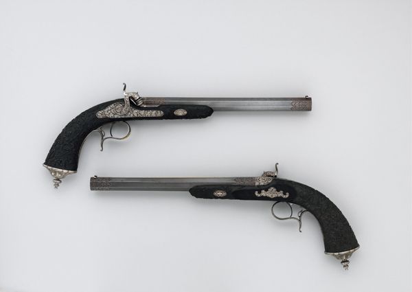 Curator: These percussion target pistols are stunning; the intricate details almost obscure their intended use. They were created by Alfred Gauvain, made in France for the Crystal Palace Exhibition in London, 1851. Editor: Initially, I’m struck by the juxtaposition of beauty and violence. The ornate silver detailing gives these instruments of death a glamorous, almost celebratory appearance. Curator: And that is precisely the point; it was all about presentation. The Victorians were obsessed with aesthetics and technological progress. Gauvain used mixed metals, primarily silver, to elevate the humble pistol to an art object fit for display at the first World’s Fair, highlighting French craftsmanship. Consider how he employs sculptural details that showcase his mastery, while at the same time, reinforcing imperial authority. Editor: Right, there’s an inherent tension here. The exquisite artistry contrasts starkly with the pistols' deadly function. Who were these intended for, though? The aristocracy, certainly. What power dynamics are at play when we consider the purpose of the weapon? This was the height of colonialism; we need to recognize these not merely as luxury items. Curator: Absolutely. But look closer at the methods; it also reveals a certain commodification of violence and status. They transform raw materials like metal and silver using techniques rooted in French neoclassical design traditions. They signal status. Editor: Still, these items represent the culture of their age. While the craftsmanship involved is remarkable, let’s be forthright about who stood to benefit from this sort of technological and decorative opulence. Power structures must always be addressed. Curator: I concede, but can't we appreciate Gauvain's innovative crafting within that context? His attention to detail is superb! Editor: Of course, one can admire the skill but we need to analyze its complicated legacies. Curator: Indeed. Looking at these beautiful yet functional objects, they hold up a strange mirror, one that reveals 19th-century tastes for artistry and a societal hunger for violence, both simultaneously. Editor: Perhaps it’s a reminder that beauty can often mask difficult realities and, vice versa. This tension should push us to consider our modern complicities.