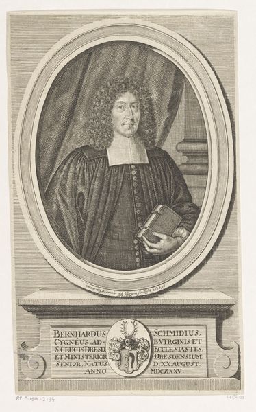 Curator: Look at this piece. We're viewing Nicolas de Larmessin's engraving, "Portret van Jérôme Bignon," created in 1663. It resides here in the Rijksmuseum. Editor: Mmm, my first impression is of quiet dignity. The face seems to be lit from within, it feels gentle but precise. A melancholy grace almost. Curator: De Larmessin certainly captures the essence of his subject. The Baroque style is evident in the detailed rendering of Bignon's hair and the ornate frame surrounding him. Note the texture, created entirely through line. It makes it really engaging to spend time looking closely at the image. Editor: Yes, the engraving technique is exquisite, a showcase of craft! The texture and tonal gradations are impressive. What always strikes me about portraiture, especially something so formalized, is the sitter's agency—how much is projection, and how much collaboration? Curator: The inscription below the portrait adds another layer. The inscription reads, in essence, "What was rare in the past, remains so today." It praises Bignon and invites the viewer to really see him. Considering Bignon was a prominent lawyer, librarian, and advisor to the King, de Larmessin wasn't merely capturing a likeness but commemorating intellectual status. Editor: I suppose what I find fascinating is that despite all the indicators of position and achievement, one can't quite shake the feeling that what you're seeing is an incredibly complex emotional life—one made of far more than a wig, position, or title could express. Curator: Absolutely. Art is often a window, not just into a subject's life, but also into a wider cultural understanding. Editor: Well put! Every mark, tone, and texture—a story. Thank you!