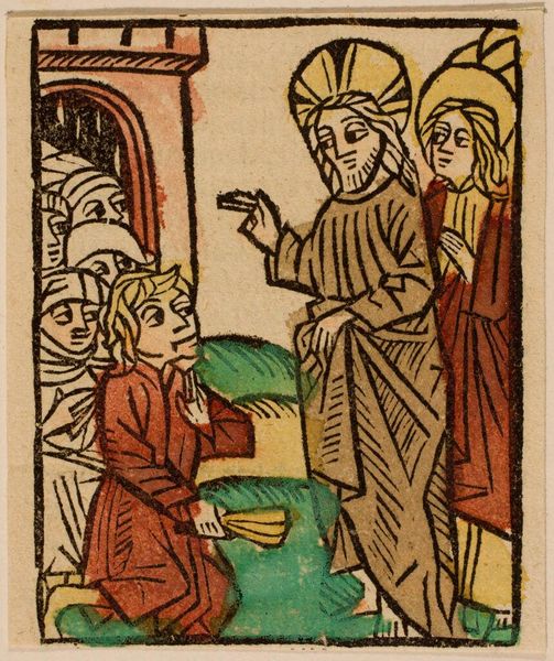Editor: Here we have "Illustration I," by an anonymous artist, housed at the Harvard Art Museums. I'm struck by the awkward posture of the kneeling figure. What story do you think this image is telling? Curator: It reminds me of those medieval morality plays! See the little green demon hovering near his face? Maybe it's a scene of temptation, or perhaps even exorcism. What do you make of the flat, almost cartoonish style? Editor: It feels very direct, like a visual sermon. I guess it lacks nuance, but maybe that's the point? Curator: Exactly! It's like a punchy visual statement, designed to stick in your mind. It makes you wonder about the power of images in a world before everyone could read, doesn't it?