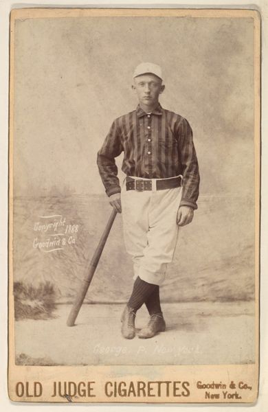 This sepia-toned photograph, "Donnelly, 3rd Base, Washington," was produced by Goodwin & Company around 1887 as part of the "Old Judge Cigarettes" series. The composition is dominated by the figure of a baseball player, centrally posed with a bat, against a muted backdrop. The limited tonal range creates a sense of depth and focuses our attention on the subject. The photograph is structured around a play of horizontal and vertical lines: the horizontal stripes of the baseball cap contrast with the verticality of the bat and the player's stance. This creates a visual tension, suggesting both stability and potential action. The placement of the figure against a plain background isolates him, emphasizing his form and the tools of his trade. The image exists as a signifier of late 19th-century American culture, where sport, advertising, and tobacco intertwined. The use of photography as a mass-producible medium allowed for the commodification of public figures. "Donnelly, 3rd Base, Washington," prompts questions about the construction of identity and celebrity, and how images are used to convey cultural values.