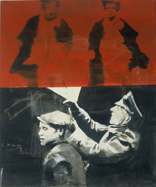 Editor: This is Sidney Nolan’s *Burning at Glenrowan*. It feels… chaotic. The stark black figure in the foreground contrasts with the fiery scene behind. What historical context am I missing? Curator: Nolan often explored Australian identity through the lens of the Ned Kelly legend. This scene depicts the final siege. How do you think the imagery challenges or reinforces popular perceptions of Kelly? Editor: It’s like the police are framing the burning inn—almost complicit. Is Nolan critiquing the official narrative? Curator: Precisely. Nolan uses visual language to question power structures and the construction of national myths. Seeing it this way, does the painting take on a new meaning for you? Editor: Definitely. It’s not just a historical scene, it's a politically charged commentary on how history is remembered and by whom. Thanks!