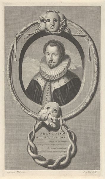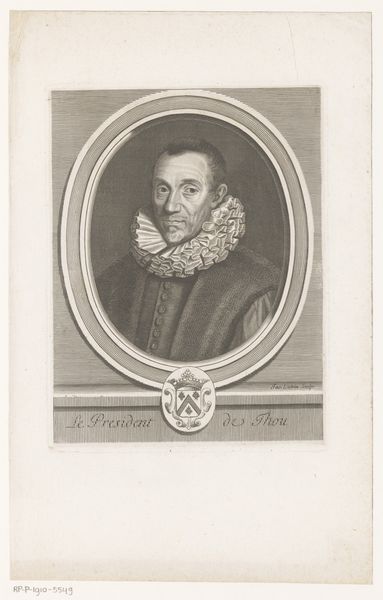 Curator: Before us is "Portret van Filips van Marnix, heer van Sint-Aldegonde," an engraving created between 1790 and 1796 by Jacob Houbraken, currently held at the Rijksmuseum. Editor: It’s striking how much this detailed portrait conveys. Just at first glance, there's a definite air of melancholy, but also authority about this figure; the eyes are rather intense. Curator: Houbraken has masterfully used the medium of engraving to give a very convincing representation. The fine lines create a nuanced sense of depth and texture, particularly in the rendering of the sitter's garments. Observe the careful rendering of the ruff collar and fur robe! Editor: Absolutely. This depiction of Filips van Marnix places him firmly within a context of wealth and power. We should remember he was a significant political and intellectual figure during the Dutch Revolt. Seeing him portrayed with these symbols reinforces his standing. I am struck by the fact that the OCR indicated '1578', yet the work was made from 1790-1796. What might the relevance of 1578 be? Curator: A plausible theory may be that the work is referencing a significant year in Filips van Marnix's life or some pivotal moment associated with him. Also observe how the oval frame serves as a kind of proscenium arch, framing the subject for posterity. Editor: Yes, and the inscription further reinforces this constructed identity of the historical figure, cementing his place in the lineage of Dutch heroes at a time of enormous political shifts. It is crucial to remember these works function to propagate cultural and historical narratives that shape identity and reinforce power dynamics. Curator: Indeed. Considered structurally, we could argue the portrait is both a literal and symbolic representation that relies on carefully chosen iconographic details to project an elevated image of its subject. Editor: Ultimately, this portrait invites us to critically consider the interplay between representation, power, and identity. And the artist's choice in rendering this engraving from a specific historical period of transformation encourages an active engagement with these lasting questions. Curator: Indeed. It serves to explore both formal and thematic depths as a lens through which we can reflect on our own values.