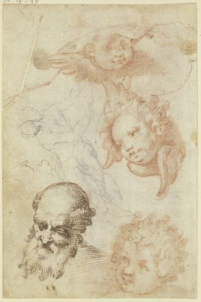Curator: Here we have a sheet of studies by Joos van Cleve, titled "Studienblatt: Köpfe von Christus, Maria und zwei weiteren Männern" – a sheet of studies of heads featuring Christ, Mary, and two other men. Editor: Wow, what strikes me first is the sheer sadness emanating from these faces, particularly Mary and Christ. Their eyes are cast downward, almost as if they're weighed down by the sorrow of the world. Curator: It's fascinating to consider this in relation to artistic practice at the time. Sheets of studies like this one were common training devices for artists. The Städel possesses a considerable collection, enabling insight into workshop practices and model books. The use of charcoal and ink on toned paper really enhances the shadows. Editor: The fact that these are studies complicates things for me. Are we meant to view them as isolated expressions of grief, or as components of a larger, perhaps propagandistic, narrative? Knowing how art and religious institutions historically wielded visual language to control emotions and beliefs, I am critical. Curator: It’s both, I think. Van Cleve was active in a workshop setting, where model books or sheets of studies would have facilitated a uniformity of style, or at least an ease in executing common motifs. But there is a great individuality here, in the attention to musculature, and facial features that makes them much more than rote copies. These faces were rendered from life in preparation for altarpieces commissioned by the church. Editor: I appreciate the way Van Cleve captures the weariness of the figures. I wonder, how might contemporary viewers interpret these studies in light of the ongoing struggles against systemic injustice, especially if you think about religious leaders turning a blind eye to contemporary human suffering? Curator: The accessibility is key, I think, here at the Städel. Art institutions, particularly those with deep ties to specific political entities or patronage, play an active role in constructing what gets to be visible and by whom. The figures are simultaneously historically placed, yet eternally relevant, in a way that continues to attract viewers and, hopefully, generate a broader understanding of the contexts that made this kind of religious work possible. Editor: Absolutely. It reminds us of art's continuing ability to spark conversations and questions that transcend time. The convergence of grief, devotion, and artistic skill – alongside a critical understanding of how art can manipulate emotion – can make a really lasting impact.