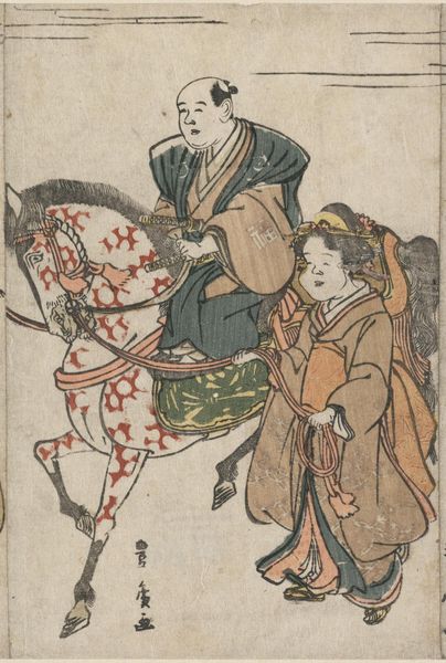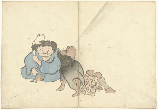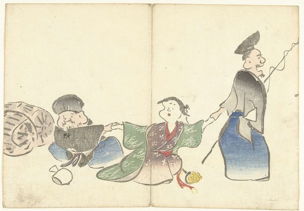 Curator: Before us we have "Jo en Uba", created by Nakamura Hōchū around 1826. Executed with ink and color on paper, it's a charming Ukiyo-e piece. The figures certainly dominate the composition, but what immediately strikes you? Editor: The simplified rendering. Notice how the colors are in solid blocks that define shape. See the very faint wood grain of the key block, even the awkward alignment of the colour blocks give it a wonderful tactile, even modern feel. Curator: Absolutely. Ukiyo-e, translating to "pictures of the floating world," often depicted scenes of daily life and beauty. Do you detect a particular narrative element here? Editor: Without doubt. It seems to me the couple references the mythical pair, Jo and Uba, symbols of marital harmony and longevity, often depicted as an elderly couple tending to a pine tree and even shown with rakes. Curator: Exactly! The symbols are subtly placed to evoke cultural references, perhaps reflecting popular values or beliefs about family. And that stylized pine adds to the overall theme, too. Editor: That reminds me; the symbolism isn't strictly narrative but carries deeper societal meanings. The pine symbolizes long life, steadfastness, and resilience, especially for the Japanese at that time. Those rakes the elderly couple used gather pine needles are also a symbol, the gesture implies one "rakes in fortune." Curator: I agree! But, looking at how the flat planes interact in relation to each other, creates a flattening of depth but offers up an unusual kind of visual delight! The colour relationships are harmonious, but it goes further than surface deep—with that compositional clarity, you cannot help but feel the artist is also trying to connect something deep. Editor: I agree the effect is memorable. I am reminded that objects here gain their real significance from layers of meaning they bring and continue to offer the viewer today. Curator: Precisely. "Jo en Uba," more than just a simple domestic scene, holds its unique cultural memory to encourage meditation.