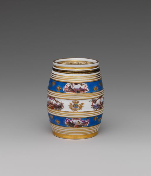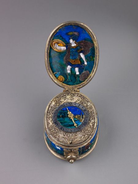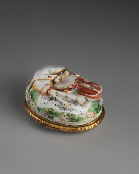 Alexander James Strachan created this box with a portrait of a woman, possibly Mrs. Bates, as Flora. Consider the formal properties of the box: the reflective, gilded gold against the matte miniature portrait. The circular structure, embellished with intricate floral patterns, frames a delicate portrait of a woman, Flora, the goddess of flowers. The choice of gold and the detailed craftsmanship speak to a celebration of beauty and value. The portrait itself, with its soft pastel hues and gentle brushstrokes, offers a moment of intimate beauty, yet it is encased and framed by the opulence of the box itself. This contrast highlights the symbolic nature of the portrait, perhaps pointing to idealized notions of femininity and its place within a structured, material world. This work operates within a semiotic system, where materials and images are used to communicate social status and beauty standards, prompting us to consider how art functions as a reflection of cultural values. The box is not merely decorative, it is a structured narrative, inviting ongoing interpretation.