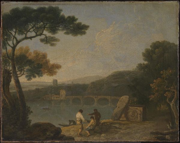 Curator: This is "Landscape with Figures" by Giuseppe Zais, a work by the Venetian painter made sometime in the 18th century. Editor: It's quite somber, isn't it? The muted palette really emphasizes the contrast between light and shadow. Curator: These landscapes were quite popular in Venice, often commissioned by wealthy patrons seeking to evoke a sense of idyllic retreat. Think of it as a kind of visual escapism. Editor: The brushwork is wonderfully loose, particularly in the rendering of the foliage. It creates a sense of movement and immediacy. Curator: And, of course, the inclusion of figures, however small, adds a narrative element—hinting at daily life and social interactions within this constructed paradise. Editor: It is fascinating how the composition leads the eye from the dark foreground to the softly lit horizon, creating a feeling of depth and tranquility. Curator: Indeed. Zais's ability to blend observation with idealized forms is remarkable, reflecting the artistic and cultural sensibilities of his time. Editor: A perfect example of how formal analysis can offer insight into the cultural milieu.