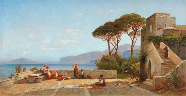 Editor: This is Oswald Achenbach’s “The Bay of Naples,” painted in 1877 using oil paints. It's quite striking, especially the hazy atmosphere and the tiny figures in the foreground gazing out at the sea. What do you see in this piece? Curator: I see the yearning for an ideal. Think about the Vesuvian smoke; it’s a recurring motif of latent power and unpredictability that belies the prettiness. What do you suppose it meant to display well-dressed tourists at such a famous landmark? Editor: It's interesting that you mention the smoke! Maybe it’s a reminder of nature's force versus humanity's fleeting presence. The tourists seem almost staged. Perhaps they are symbols of aspiration or societal status. Curator: Indeed! Remember, the volcano looms large in the background, both geographically and psychologically. What memories are carried within that plume of smoke? Pompeii? Or the promise of a prosperous future by capitalizing on beauty? Do you feel the romantic gaze? Editor: The symbolism is definitely layered, pointing towards both ruin and rebirth. And the tourist gaze, that need to witness and capture beauty for oneself – there’s something complicated in that, the beauty versus its commercialization. Curator: Precisely! And consider the color palette. Soft pastels dominate, evoking a sense of peace and tranquility. Yet, the subliminal symbolism suggests a complex undercurrent. How does that tension speak to the piece’s endurance? Editor: I never considered how the palette contrasted the dormant danger. That is thought-provoking! I guess its endurance lies in that contrast. I see it capturing a specific moment in time, where beauty, history, and commerce converged. Curator: A convergence which continues to echo today! Editor: Absolutely. Thank you – I will think differently about landscape paintings from now on.