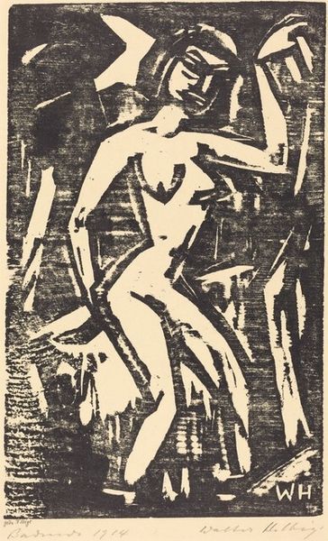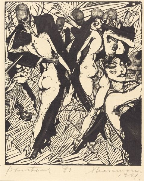 Ernst Ludwig Kirchner created "Die Frau und die Männer" with woodcut techniques, diving into the complex dynamics between women and men in German society. Kirchner, a key figure in the Expressionist movement, used his art to explore themes of alienation and the human condition. Here, the central female figure stands out, her smooth form contrasting sharply with the rough, textured representations of the men surrounding her. These men, rendered with a raw and primal energy, seem to either adore or implore her. Kirchner challenges traditional representations of women, presenting them as figures of power and agency. Yet, this can also be seen as the artist’s subjective experience, portraying a tension between desire and societal expectations. The high-contrast woodcut amplifies the emotional intensity, reflecting the Expressionist focus on conveying inner feelings and states of mind through bold, abstracted forms. Kirchner's approach invites us to consider the ways gender roles and interpersonal relationships were being negotiated and questioned during a period of significant social upheaval. The artwork prompts us to consider the complexities of human relationships and the search for identity amidst the shifting cultural landscape of early 20th century Germany.