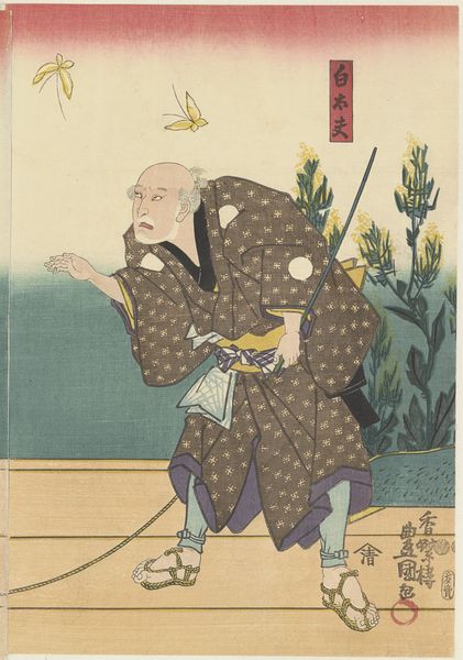 Curator: This is a woodblock print by Utagawa Kunisada, titled "Actors." It resides here at the Harvard Art Museums. Editor: It feels immediately tense. The figure’s stance, the drawn sword, even the snake at his feet... It all points to impending action, doesn’t it? Curator: Absolutely. Kunisada was a leading designer of ukiyo-e prints, and he was particularly known for his dynamic Kabuki actor portraits. His work often reveals the cultural importance of theater in 19th-century Japan. Editor: You know, I love how the composition leads your eye. The bold black robes, the precise lines of the sword... it’s all so carefully orchestrated to create this feeling of heightened drama. I can almost hear the clack of wooden sandals on the stage. Curator: And Kunisada’s use of symbols—the actor's crest on the robe, the snake as an omen—speaks to the rich layers of meaning embedded within the work. Editor: It’s more than just a portrait; it’s a story frozen in time. Curator: Indeed. It offers a glimpse into the vibrant world of Japanese theater and the cultural values it reflected. Editor: It certainly leaves you eager to know what happens next, doesn’t it?