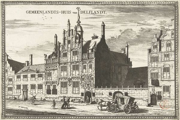 Editor: So, this is Abraham Rademaker's "View of the Old Town Hall of Amsterdam, 1640," created between 1727 and 1733. It's an engraving, giving it a detailed, almost architectural feel. What strikes me is the everyday bustle captured in such a precise way. How do you see this piece through a different lens? Curator: I'm immediately drawn to the materiality and labor involved in producing an engraving like this. Consider the social context: the Dutch Golden Age, a period of immense economic growth. This print, a multiple, makes the image accessible to a wider audience than a painting could. How does the consumption of such images affect our understanding of Amsterdam's identity? Editor: That’s interesting. I hadn't considered the democratizing aspect of prints in that era. The work shows this grand building, but its reproducibility kind of challenges that sense of hierarchy... Curator: Exactly! Think about the engraver, Rademaker. He's not just depicting a scene; he’s processing materials—metal plates, ink—engaging in physical labor to create a commodity. His labor is contributing to the marketplace of images, to the developing visual culture. Does knowing the process behind it change how you see the cityscape itself? Editor: It does! I’m suddenly more aware of the artist’s hand and the commercial aspects of artmaking, rather than just admiring the architectural details. The details of the people really help it feel real, almost manufactured realism? Curator: Manufactured realism. Precisely! We see Rademaker engaging with ideas about authenticity and how meaning is crafted. It speaks volumes about social relationships during the time period! Editor: This makes me appreciate not only the artistic skill but also the societal function of the work. Curator: And that is what focusing on process, production, and material can unveil!