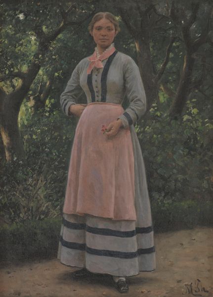 Curator: What a lovely sense of movement! The artist has really captured a fleeting moment of joy and freedom, hasn’t he? Editor: He has indeed. What we're looking at is a study in oil paint made by Wilhelm Marstrand. It's titled "Dancing Roman Woman. Study for Romans Gathered for Merriment at an Osteria", and it dates from before 1838. Marstrand, of course, was painting during a fascinating time for artists in Europe. Curator: The angle immediately brings to mind certain social constructs around viewing women, doesn’t it? We are positioned to look at her, and yet she isn’t offering her gaze in return. The artist frames the woman as an object of beauty and vitality, yet from a relatively safe, removed vantage point. Editor: That's very astute. Consider that her movement also implies liberation from strict social roles. Dance, historically, has been a very culturally regulated activity; but this one feels very free, expressive, personal even. Note the fabric. Curator: The interplay between the darker blues and greys of her bodice and the white and gold of her skirt seems almost allegorical. The colors draw the eye down to where her hand gestures highlight the movement in the fabric itself, an expression of lightness. The bare feet suggest a type of rebellion against the stiff corsets of the day. What could this moment signify about social change? Editor: Perhaps. And perhaps this speaks more to Marstrand’s perspective as an artist and an outsider looking in on this figure of a woman and the traditions of dance. This might also speak more generally to the artist's position relative to his subject, an engagement with how we observe those we represent in painting. Curator: It’s striking how a relatively simple composition can generate such interesting discussion, isn’t it? The very act of painting becomes part of the broader story, influencing its place within social structures. Editor: Indeed. There is always something to discover, and uncover, within each artwork, when you apply an open mind.