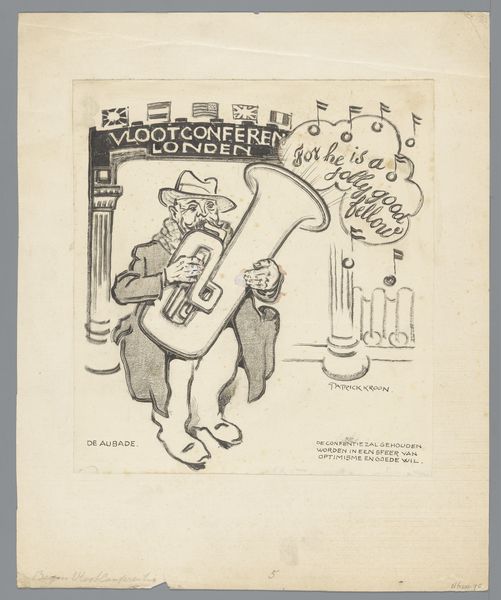 Curator: Here we have Johan Michaël Schmidt Crans's "Spotprent over het zomerreces, 1887," a drawing created in ink and pen. The work offers a snapshot of a specific moment in time. Editor: My first thought? Total relaxation. It's the ultimate "do not disturb" sign, sketched in lines that feel both precise and a little bit mischievous. Curator: It’s certainly meant to be wry. Schmidt Crans created this as a commentary on the parliamentary summer recess. The figure reclined in the chair is a parliamentarian enjoying his time off. Editor: Oh, I love that! You’ve got him kicking back, cigar in mouth. What a delightful way to stick it to the man, using what looks like his own sketchbook to make it. The words swirling behind him--those are the pressing issues of the day, right? Curator: Exactly. Things like "grondwetsherziening," constitutional reform, and references to other political matters. They’re like a cloud of concerns he’s blissfully ignoring. Editor: Brilliant! The composition, with the cityscape in the background, really anchors it in a specific place and time. There's an "everyone else is working but me" vibe that's hilariously timeless. Curator: This image served a specific function: political critique. It appeared as a cartoon in a magazine during a moment where political tensions were high. Consider its reception by both political elites and the general public at that moment. Editor: Well, regardless of political stance, I imagine even his detractors were snickering. You know, finding some truth in the caricature! It takes real wit to distill complex issues into a single, impactful image. Curator: And it highlights how art functions within society, shaping public discourse and reflecting societal anxieties. Editor: Indeed. It makes you wonder what a modern-day version of this would look like with our endless news cycle.