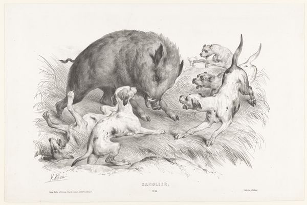 Editor: So this is Charles Jacque's "The Wombat, from 'Le Magasin Pittoresque'," created in 1864. It's an etching, which I find fascinating. I’m curious, looking at the way it depicts these wombats in what seems to be a natural environment...what catches your eye when you see this piece? Curator: Well, first I consider the "means of production", in this case, the printing press. These images, multiplied, disseminated knowledge and, perhaps, a sense of wonder about the natural world. How does the "mass production" impact its cultural value, in your opinion? Editor: That's interesting! I hadn’t thought about it like that, like it's almost a "commodity of knowledge". Does the relatively simple "engraving" process diminish its artistic merit? Curator: Not at all. I'm more intrigued by the process: The image of the wombats as the "product of labor" mediated through the engraver's skill. Consider the original context—"Le Magasin Pittoresque" – a widely circulated magazine intended to educate and entertain. So, whose "labor" and what resources contributed to the consumption of these images by the public? Editor: Right, there were writers, editors, distributors… It highlights how a piece of art isn’t just about the individual artist, it is also collaborative work with a goal of popular culture. Thank you, now I have so much to think about. Curator: Precisely, by shifting the focus to its materiality and conditions of making, the relationship between art, labor, and the growth of consumer culture becomes tangible, right? It's exciting to look beyond the image and examine the process, the context, to understand its full historical picture.