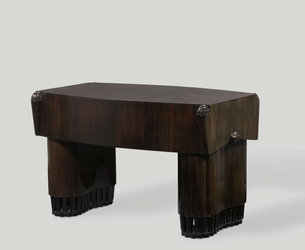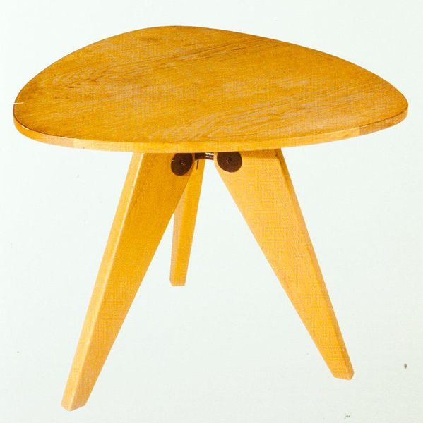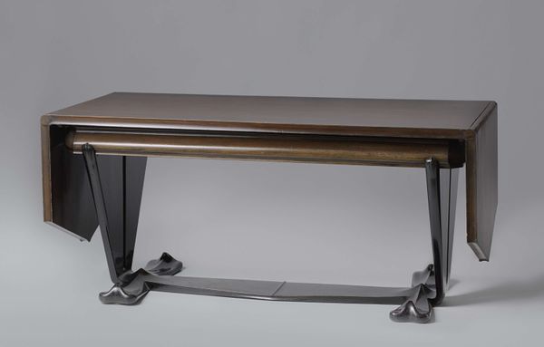 Editor: Here we have Isamu Noguchi’s “Coffee Table,” created in 1945, featuring glass and wood. The design is incredibly simple yet elegant. How do you interpret this work, especially given the historical context? Curator: What strikes me is how this table functions as a potent symbol of post-war optimism. The biomorphic form of the wood base, paired with the sleek glass top, speaks of a harmonious relationship between nature and technology – a key aspiration in the reconstruction era. Notice the subtle curves and the dark wood, resembling abstracted wings or perhaps even a stylized pelvis. Doesn’t it evoke a sense of growth and groundedness? Editor: I see what you mean about the symbolism. The glass on top reminds me of clarity and a new beginning, yet I keep wondering about the symbolism and its ties to Japanese artistic philosophy. Curator: Precisely! Noguchi, with his Japanese-American heritage, consciously blends Eastern and Western aesthetics. The table's simple lines and emphasis on natural materials align with traditional Japanese design principles, subtly nodding to concepts like "wabi-sabi," finding beauty in imperfection and impermanence. Consider how this piece contrasts with the heavy, ornate furniture that preceded it. It's a radical departure! It implies a forward looking philosophy focused on organic beauty, harmony, and natural forms. The dark-toned base may even speak to resilience, don’t you think? Editor: Absolutely, that is eye-opening. The blend of Eastern and Western aesthetics to communicate something about hope is ingenius! Curator: It does provide insight on the ability to visually encapsulate historical narrative!