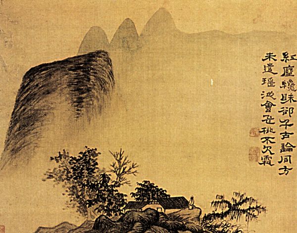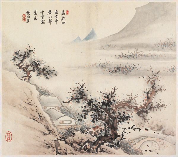 Editor: We're looking at "Keimyung Gok Amdo," a landscape attributed to Shin Yun-bok, crafted using ink and watercolor. There's a lovely serenity to it; the soft washes and muted tones create a really peaceful scene. What story does this piece tell, historically? Curator: Well, consider the Joseon Dynasty context. The rise of *Silhak*, practical learning, pushed artists to look beyond idealized visions of China and instead depict Korea’s *real* landscapes. Notice how the mountains, though stylized, feel grounded? This wasn't just about pretty pictures. It was about national identity, asserting a Korean aesthetic against the dominant influence of Chinese art. It’s also about the elite class displaying their knowledge and control of their land through visual means. Editor: So it’s a form of cultural self-representation through landscape? Curator: Precisely. What do you make of the buildings nestled within the landscape? Their prominence and relationship to nature? Editor: It feels deliberate, not just like randomly placed architecture. Like they’re part of an integrated system. The built environment complements nature and vice-versa. Curator: Right. Consider also, who commissions and consumes these images? The literati class saw communion with nature as vital to personal and societal harmony. Owning such paintings was a signifier of cultivated taste and political standing, a declaration of alignment with Confucian values in a shifting social landscape. We can read this work then not simply as a pretty scene, but as an artwork embedded in complex social and political meanings, especially regarding identity and status. Editor: That completely changes my perspective! Seeing it now as an assertion of Korean identity within these broader socio-political structures...fascinating. Curator: Exactly, there is always so much more to it. Understanding context lets us appreciate it at a new level.