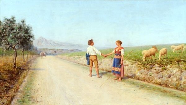 Curator: Gerolamo Induno painted this, entitled "The Garibaldian," in 1871. Editor: I am struck by the quiet intimacy of this scene; the composition gives a sense of anticipation—a breath held. The earthy tones and soft light make it feel familiar, as if plucked from memory. Curator: Induno situates this encounter amidst the tumultuous period of Italian unification. The Garibaldian soldier, a symbol of revolutionary zeal, pauses here, meeting the gaze of a peasant woman. What sociopolitical tensions simmer beneath their interaction? Editor: Precisely. And look at how Induno uses costume here— the red shirt of the soldier speaks to the fiery spirit of the Risorgimento movement. Note the contrast between the man's uniform, a declaration of his role and the more demure garb of the young woman; its colours echoing those in the distant, peaceful landscape. There’s an intentional balance in their representation. Curator: The visual language here is incredibly potent. This chance meeting, this dialogue, is loaded. The woman is seated while the Garibaldian stands, drink in hand, seemingly in a position of power. But what agency does she hold? Is her stillness strength, a refusal to be moved by his fervor? The composition implies she remains tethered to home and the soil. Editor: Yes! Consider that Garibaldi's efforts hinged significantly on support from the common people of Italy; and that support would have come primarily from the women tending the home front. Her simple bowl of perhaps mended coins echoes his glass of wine and symbolizes both sacrifice and plenty. What has she given to his cause? What does he offer her now? Curator: This painting is asking us to reflect on the complicated relationship between revolutionary movements and the individuals whose lives they inevitably disrupt. It pushes us to think critically about how grand narratives impact everyday experiences. Editor: Looking at the shared glances between these two I feel the weight of history meeting a common human exchange; in one moment captured through careful symbology. Curator: I agree. Ultimately, this artwork prompts questions about how collective identities are shaped through individual interactions in turbulent times. Editor: Indeed, a captivating meditation on an intersection between the Italian cause and its effects at home.