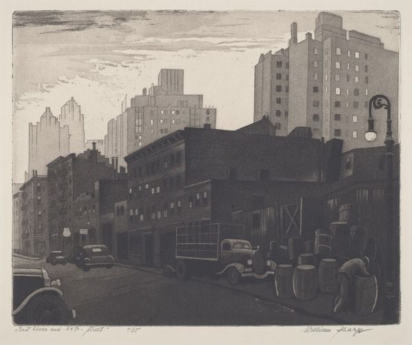 Editor: So, this is "New York, 48th Street," a woodcut print made in 1927 by Aries Fayer. It’s so stark, all sharp angles and strong contrasts. The city feels overwhelming, almost claustrophobic, despite the implied vastness of the buildings. What do you see in this piece that really stands out? Curator: The strength of this piece resides primarily in its rigorous composition. Note the oppressive geometry—the sharp verticality of the buildings, repeated and intensified. Observe how the artist meticulously manipulates light and shadow to create depth, pulling the eye toward an implied vanishing point far in the distance. Do you notice how the faceless crowd contributes to a sense of impersonal urban existence? Editor: Yes, the crowd seems less like individual people and more like another geometric shape fitting into the grid. And the sky—those dramatic gouges create such tension. It's like the city is fighting against nature. Curator: Precisely. The scratches in the sky—a negative space, of course, in the print—function as an abstract counterpoint to the rigidity below. These formal relationships are everything. Consider, too, the materiality: the stark contrast is a result of the woodcut medium itself. What effect does that contrast achieve? Editor: It amplifies the drama and gives the city a harsh, unforgiving feel. It’s a perfect match of medium and subject, almost brutal. It really speaks to the power and scale of early 20th-century New York. Curator: Indeed. Fayer uses formal elements to effectively convey not just the *look* of New York, but its *feel*. Editor: This has opened my eyes to looking at the composition in relation to its other features in artwork, and not separately. Thanks!