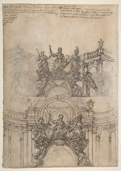 Curator: Here we have an intriguing pen and ink drawing, "Drawing for a Palace Decoration," created sometime between 1700 and 1800 by an anonymous artist. It's currently held here at the Metropolitan Museum of Art. Editor: The starkness of the black ink on paper is what hits me first. There’s almost a blueprint quality to it, like looking at the plans before the grand thing itself takes shape. Curator: Precisely. The meticulous line work captures the essence of Classicism. It reflects the formal language and visual vocabulary of power that permeated European court culture. Note how architectural elements intertwine with figurative sculpture. This drawing served a very specific purpose within that system. Editor: Absolutely, and I find it fascinating to think about the physical labor embedded within this image. From the making of the paper itself, likely from rags, to the mixing of the ink, probably from gall nuts. Each decision reveals the resources and means available at the time. Look at those drapes – imagining replicating that level of ornamentation today… it’s a different world of production altogether! Curator: Indeed. Think of the hierarchies this artwork implies, those it represents, and those it bolsters. The creation of palace decorations reinforced established social orders, solidifying the position of the monarchy through carefully curated displays of wealth, refinement, and supposed divine right. It’s also important to acknowledge it through art's public role and imagery in the political process. Editor: While admiring the overall visual effect, I'm struck by how fragile these materials are – paper and ink. A potent reminder of the tension between aspiration and impermanence of even the most opulent symbols. How fleeting our own endeavors might be, framed against such a history. Curator: A keen observation. Reflecting upon this drawing, one recognizes that even designs, intended to symbolize enduring authority, become artifacts shaped by time and circumstance. Editor: Thinking about it further, you see more clearly how its physical reality, this arrangement of ink on paper, links it back to those conditions.
