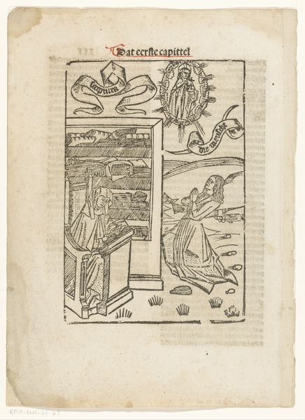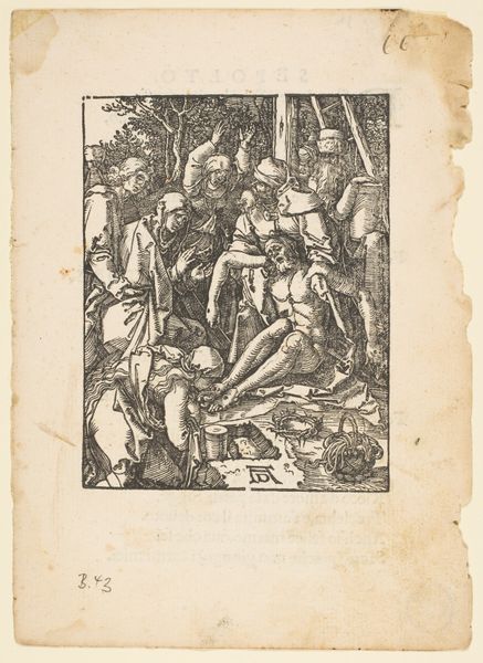 Curator: Look at this fascinating leaf from The Nuremberg Chronicle, a "Dance of Death" created in 1493 by Michael Wolgemut. It's a woodcut, isn't it striking? Editor: Strikimg is one word for it; macabre is another! The contrast of light and shadow creates such a strong sense of dread. The way these skeletal figures are composed—some dancing, some mourning—it’s really unsettling. Curator: Well, these kinds of images were popular at the time and deeply embedded in social and religious consciousness. We need to remember that it would have been reproduced on a relatively large scale for that time, influencing many different audiences and classes. Its appearance in the Nuremberg Chronicle indicates its purpose wasn't just aesthetic, it was didactic, aimed to remind readers about their morality and eventual death, acting almost like a medieval meme! Editor: And how much do you think the method influenced the aesthetic? With woodcut as a medium, Wolgemut had to be decisive. The cuts are so clean, the lines defining. The labor involved is substantial; carving the wood to create the forms emphasizes how death transforms flesh back into basic, graphic lines and shapes. Curator: Absolutely. This wasn't just the work of the named artist though, but a product of a workshop, where labour was divided, tasks assigned, creating what we may define as "art" by way of industrial, early publishing practices. We also see the Northern Renaissance’s impact, shifting towards linear perspective, even if still somewhat crude, moving from symbolism toward more observational rendering of space and form. This, in addition to how this kind of visual material shaped historical understanding within Nuremberg society. Editor: True, the interplay between the means of production, from individual artists, their workshops and this Chronicle, with a social fear about mortality. I do wonder, though, if contemporary audiences understood art within its socioeconomic frameworks the way we do now. Did they register that shift, or were they more influenced by, let's say, the Church and morality? Curator: Hard to say with certainty! Though understanding that they may not have held these concepts separately is vital for an understanding of our art history, even after several centuries of research! Editor: Agreed! An uneasy reminder of mortality framed by artistic process and its cultural moment! Curator: Indeed! Thank you!