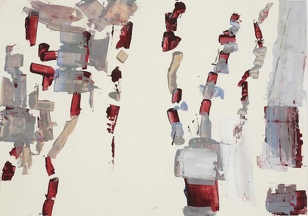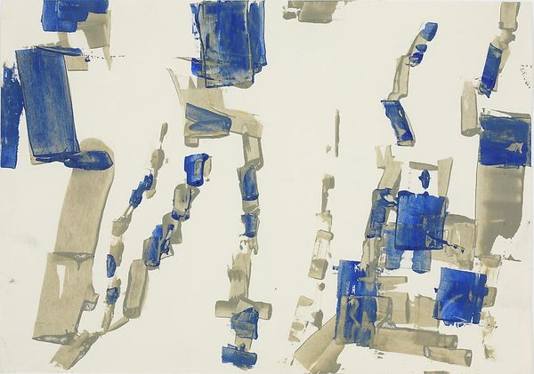 Curator: This is Charlotte Posenenske’s "Bretagne" from 1960, executed in acrylic paint. What strikes you initially? Editor: An airy melancholy. The interplay of blues and muted ochres gives it a sense of wistful reflection, almost like faded memories floating on the canvas. Curator: Note the stark white ground. Posenenske exploits the blank canvas, allowing these chromatic forms to assert their independent presence. The strokes appear as discrete entities rather than merging into a cohesive image. Editor: Indeed, the shapes do seem to exist independently, like a visual scattering. Considering the title, could these shapes symbolize abstracted landscapes, perhaps evoking fragmented memories of the Bretagne region itself? Water, perhaps? Stone? Curator: Interesting, but consider the structural relationship: the juxtaposition of hard-edged geometries with more fluid brushstrokes. Notice how each shape is both self-contained and dynamically related to those surrounding it. The lines have a specific and concrete trajectory; we shouldn’t ignore the materiality in favor of searching for familiar images. Editor: Agreed, yet symbols resonate because of collective cultural understandings. Water, stone, those notions tie into ideas about place, time, memory. The coolness of the palette, too, reinforces that impression. Curator: Coolness, perhaps. Though I'm intrigued by how these forms interact on a planar surface, producing a complex, spatial tension without representing tangible space. It plays with form and void, challenging perception. Editor: A compelling tension born from cultural symbolism, even unintended, informs its impact. Viewers likely attach emotional meanings to those colours and shapes based on personal associations and cultural memory. Curator: A reminder of the intrinsic relationship between artistic elements and human perceptions, indeed. Editor: It's like tracing a feeling back to its source.