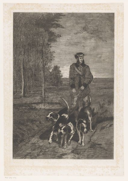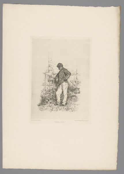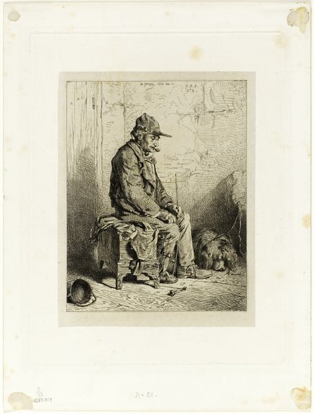 Nicolas Toussaint Charlet created this lithograph of a pipe-smoking veteran with his dog. Charlet lived through the Napoleonic era, and was later commissioned to create lithographs celebrating the Bourbon monarchy and Napoleon. Charlet's work often reflects the shifting political sentiments of his time. In this piece, we see not a glorification of war, but an intimate portrayal of a veteran in a moment of quiet repose. The veteran, marked by his worn attire, is accompanied by his loyal dog, suggesting themes of companionship and loyalty in the aftermath of conflict. His cross-armed stance might be interpreted as a posture of defense or self-reflection, while the pipe suggests contemplation. In his representation of everyday life, Charlet humanizes the veteran, shifting away from idealized depictions of heroism. This print captures a sense of shared humanity, reflecting a broader dialogue on the social and emotional experiences of those who have served.
