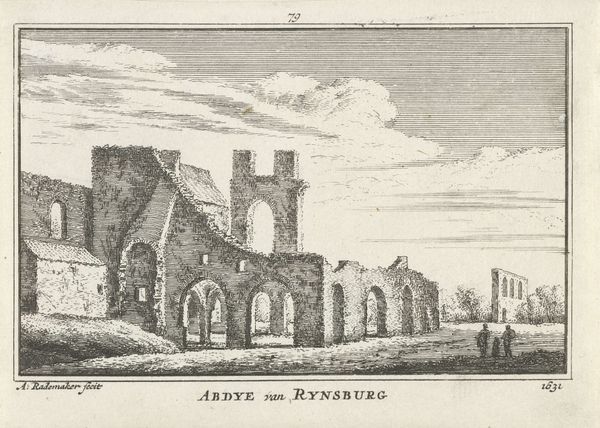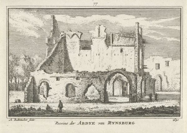 Curator: We're looking at "Gezicht op de ruïne van de abdij te Rijnsburg, 1630" which translates to "View of the Ruins of Rijnsburg Abbey, 1630." It's an engraving by Abraham Rademaker, made sometime between 1727 and 1733. Editor: It’s stark. That fine line work gives the scene an almost clinical feeling, despite depicting something so clearly crumbling and decaying. The balance of light and shadow emphasizes the fragmented architectural structure. Curator: Indeed. Rademaker was known for his meticulous documentation of landscapes and cityscapes, capturing the Netherlands as it existed then. Prints like this one became incredibly important visual records, spreading knowledge of places far and wide. Editor: The emptiness, those stark open arches – it's as much about what's missing as what's there. The structure looms, yet we're compelled to think about absence and change. It suggests time's relentless impact. There is almost nothing holding these stone walls up! Curator: That's what's so striking about Rademaker's work. While seemingly objective, the careful composition shapes our understanding of the subject. Note the positioning of figures in the foreground; they're minuscule in comparison to the ruin. The scale highlights human transience. Editor: Precisely. It creates an inescapable visual tension – this man-made structure returning back to nature. The contrast is heightened through that intricate baroque style against the humble reality of an abbey. A bit self-important maybe? Curator: Well, the Baroque prioritized ornate grandeur, often associated with power and authority. This depiction is much simpler. That could have to do with printmaking as his medium, a historically popular art that allowed him to cater to larger audiences interested in picturesque landscapes of the region. It democratized viewing, if you will. Editor: I see what you mean; this visual study does reveal tensions of fleeting power when even the seemingly eternal eventually erodes, returns, decomposes, revealing nature’s persistent claim. Food for thought. Curator: Yes, it's about viewing not just the image itself, but also its place within a broader social, historical, and aesthetic narrative. Editor: Quite right. Rademaker's careful etching offers an engaging look, beyond aesthetics alone, but to meditate on existence and impermanence.