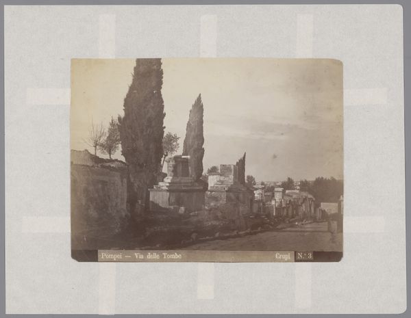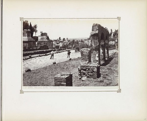 Editor: This gelatin-silver print, taken sometime between 1860 and 1900 by Giorgio Sommer, is called "Street with Remains of Tombs in Pompeii". It's quite striking. The contrast between the ruins and the implied bustling life of the original city creates a sense of loss. What strikes you most about this photograph? Curator: The photograph operates on a fascinating level beyond just documentation. It captures a specific moment in the archaeological project of Pompeii, where the past was being unearthed and presented to a modern audience, largely framed as picturesque. How does the act of photographing these ruins change our perception of Pompeii's history? Editor: That's a great point! It’s like the photographer is acting as a historian themselves, shaping how future generations view the city. Did Sommer, as a photographer, play any part in fueling the growing interest in Pompeii at that time? Curator: Absolutely! Images like these, widely circulated, influenced how the public understood not just Pompeii, but antiquity in general. These were luxury items for European tourists. They helped popularize Pompeii, solidifying its status as a site of collective memory, of art and preservation. The photograph becomes more than just a recording; it participates in a cultural and economic exchange. Editor: So, in a way, Sommer isn’t just showing us the past; he's actively building a narrative around it for his contemporaries? Curator: Precisely. By choosing this perspective, this angle, these specific remnants, he's participating in the continuous reinterpretation of history, driven by market demand and personal aesthetic preferences. Editor: I never considered the photograph itself could be part of Pompeii's story. I'll definitely remember that next time. Curator: It's these layers of context that make art history so compelling!