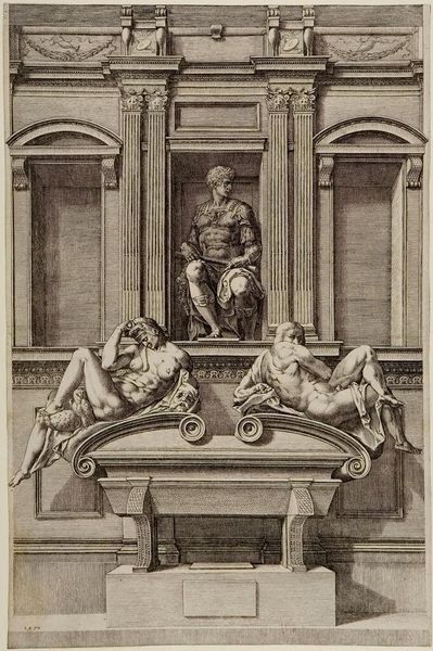 Cornelis Cort etched "The Tomb of Lorenzo de' Medici from The Tombs of the Medici" in 1570. The prominent figure of the pensive, seated man in armor immediately catches the eye. This representation of deep thought echoes the ancient philosophers and heroes, embodying Renaissance ideals of wisdom and leadership. Consider how this motif of contemplation has travelled through time, appearing in various guises from classical sculptures to modern portraits. The posture—hand to face—is not merely a physical gesture but a symbol laden with psychological weight. It speaks to the burden of knowledge, the struggle of decision-making, and the introspective nature of humanity. Interestingly, the emotional intensity conveyed by this image engages us, drawing on our collective memory of similar figures. Through such symbols, the past resurfaces, reminding us of our shared human experience and the enduring power of visual language. The image resurfaces, evolves, and takes on new meanings.