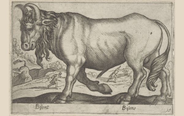 Editor: Here we have Antonio Tempesta’s "Rund," a fascinating engraving dating back to before 1650. It depicts a large animal that looks like a cross between a bull and a camel. The landscape in the background has a slightly surreal quality to it. What strikes you most about this piece? Curator: What immediately grabs my attention is the function of such imagery within the context of the time. Prints like these circulated widely. They weren't necessarily about faithful representation, but about disseminating information - sometimes accurate, sometimes less so - about the wider world, reinforcing certain colonial power structures and hierarchies of knowledge. What does the "Rund", which is labeled "Bos Scythicus" (Scythian ox), tell 17th century Europeans about distant lands and people? Editor: So it's not really about accurate zoology, but about projecting ideas? The background, with people using similar creatures for labor, does make it seem like it's about how this animal relates to different cultures. Curator: Exactly. The "Rund" isn't just an animal, but a symbol of the exotic, perhaps even the "barbaric," framed within a European understanding. Note how the relatively "accurate" detail of the beast in the foreground contrasts with the sketchy depiction of the human activity behind. That sharp contrast is key. The print mediates between the known and the unknown. It shapes how Europeans perceive different regions through simplified, readily accessible visual tropes. Editor: It's interesting how a seemingly simple image can reveal so much about the complex dynamics between Europe and the rest of the world at that time. It’s about more than just aesthetics. Curator: Precisely. By examining the print through its socio-political lens, we gain invaluable insight into the construction and perpetuation of cultural perspectives through visual culture. Editor: I never would have thought about it that way. Now I understand why focusing on the history and the distribution is so crucial for these types of works!