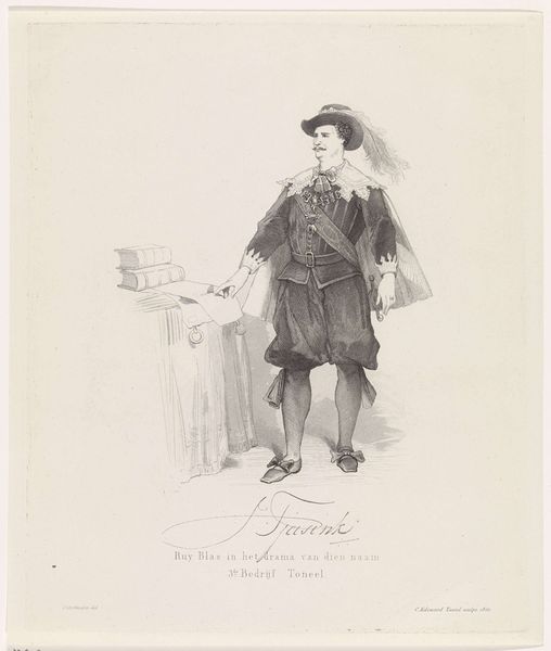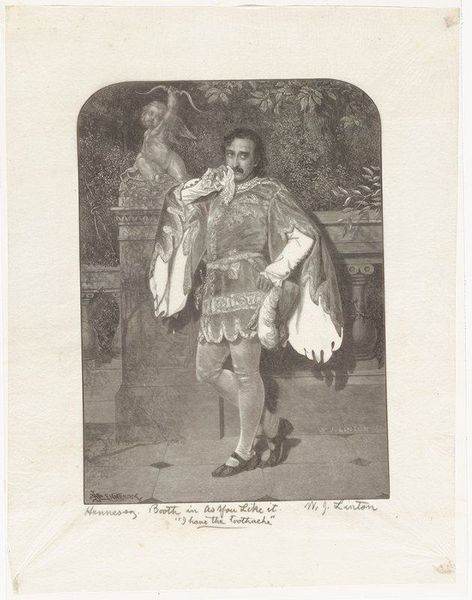 Curator: I find myself drawn to the theatricality of this etching, it's called "Don Mariano Campruli (The Ballet Dancer)" by Édouard Manet. Editor: Yes, there's a definite stage presence. He seems to be caught in a moment of contemplation, despite the flamboyant costume. Curator: Consider the context: Manet was part of a movement eager to portray modern life. What, then, does he convey through a ballet dancer? Editor: Ballet often symbolizes grace and discipline, but there's also hidden labor and vulnerability beneath the surface glamour, wouldn't you agree? Curator: Intriguing. Perhaps the costume's detail—or lack of it in the etching medium—hints at a critique of surface appearances, suggesting something deeper about societal roles and expectations of performance. Editor: A fitting point. This ballet dancer transcends a mere portrait; it makes us consider the cultural significance of performance and identity. Curator: Indeed, a compelling look at the narratives we construct through image and role. Editor: It certainly leaves much to ponder about the power of visual symbols.