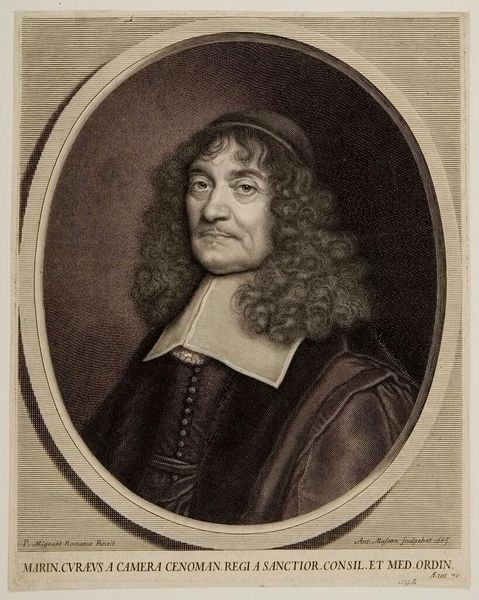 Editor: This is Claude Mellan's portrait of Nicholas Fouquet. The engraving is so detailed, almost photographic in its precision. What strikes me is the way Mellan created the textures and forms. How did he even do this? Curator: It's fascinating, isn't it? Mellan's technique involves using a single, continuous line that varies in thickness to create the illusion of light and shadow. Think about the immense labor and skill needed. This wasn't about artistic expression in the Romantic sense, but about the mastery of a craft and the production of a specific image linked to power and status. Editor: So it’s less about the artist's feelings, and more about the materials and the making? Curator: Exactly! And about what that making represents in its historical context. The availability of engraving tools, the patronage system, the role of printed images in disseminating power… it all comes into play. Editor: I never thought about art that way before; that’s a really interesting approach! Curator: It's about understanding art as a product of its time, shaped by its material conditions and social purpose.