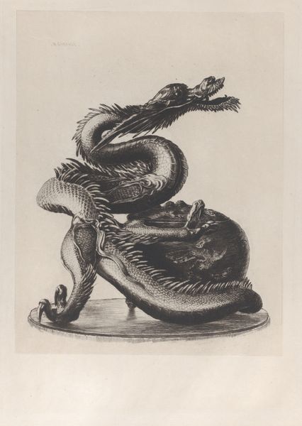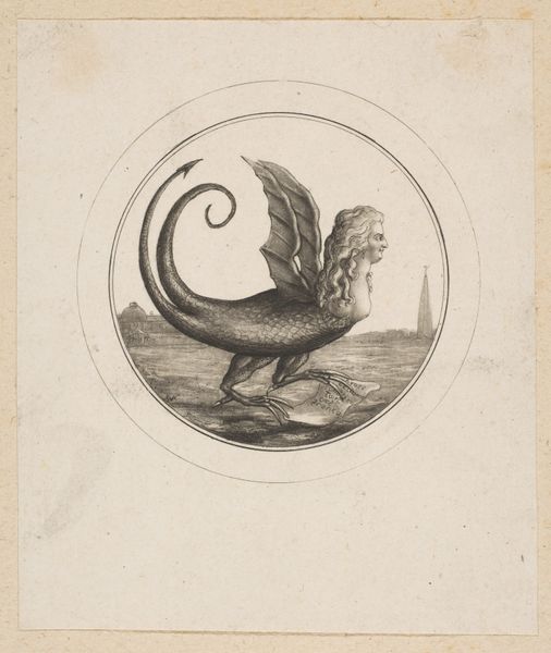 Gaetano Piccini created this circular drawing of beasts and a human mask sometime between 1710 and 1730. The composition is dominated by a snarling, reptilian head, its form contained within a precisely rendered circle. The artist has meticulously detailed its grotesque features, from the sharp teeth to the bird-like creature piercing its skull. Piccini uses a dense network of fine lines to create texture and shadow, giving the beast a palpable sense of weight and volume, contrasting with the smooth, unblemished space around it. Note how the positioning of the human mask on the left completes the circular composition, and introduces a disturbing contrast. The mask seems to react in horror, perhaps reflecting the viewer's own unease. Ultimately, this etching destabilizes conventional notions of beauty, and compels us to confront the darker aspects of human imagination and the grotesque. It asks us to consider the boundaries between the human and the monstrous, the beautiful and the repulsive.