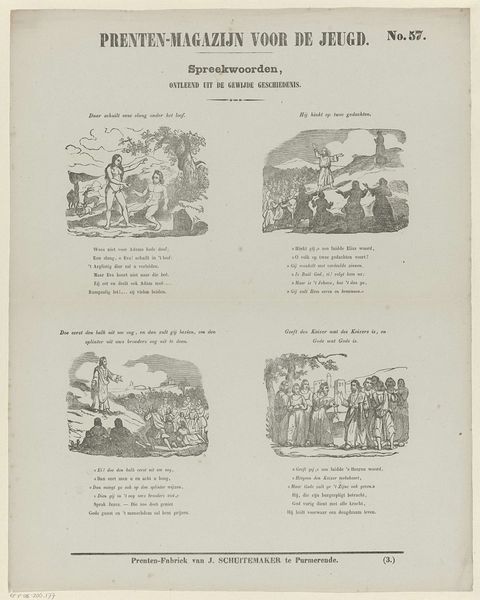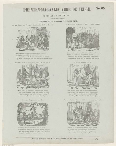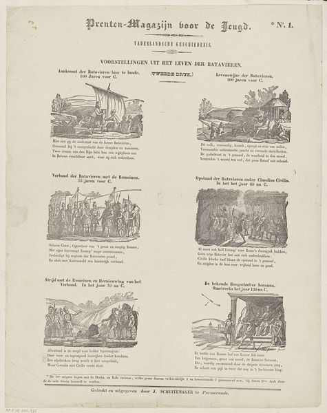 Curator: This intriguing print is titled "Voorstellingen uit de Regering der Graven uit het Hollandsche Huis," roughly translating to "Scenes from the Reign of the Counts of the Dutch House." Created sometime between 1850 and 1881 by Dirk Noothoven van Goor, it offers a series of vignettes related to Dutch history. Editor: My initial impression is that this engraving evokes a somber tone, even given the miniaturized and slightly rudimentary visual language, the depicted moments read as tense political or military struggles. The scenes convey power dynamics at play across distinct moments in time. Curator: Exactly. As an exercise in public art, it serves to solidify narratives about national identity in a time of burgeoning nationalism. The print visualizes pivotal events, likely presented to impart moral lessons and bolster a sense of shared heritage amongst young Dutch viewers, reinforcing power structures. It almost appears to function as propaganda. Editor: Interesting, the sequential nature and accompanying text offer curated historical context for a youth audience, and the style choices echo the artistic style from the Dutch Golden Age while simultaneously shaping views on governance, class, and leadership in a quickly changing Europe. Who is omitted from this history? Curator: A valid critique. The narratives centered on the aristocracy were certainly designed to uphold specific ideals while sidelining dissenting voices and alternative versions of the past. The print seems concerned with perpetuating an official historical record—we need to be equally mindful of the historical events and circumstances that inspired the making of this object. Editor: This work definitely makes me reflect on who controls historical narrative. Curator: Indeed, thinking about art means reflecting critically on social hierarchies and power, and the stories a culture chooses to tell itself. Editor: I will continue to challenge dominant cultural narratives.