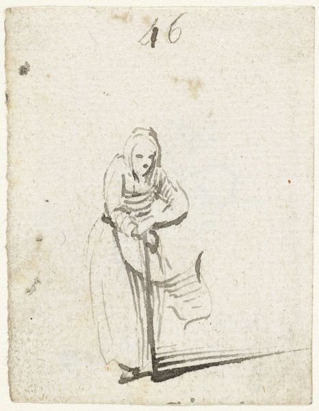 Curator: Let's delve into this intriguing image, a depiction of Moses rendered in pen, ink, and charcoal. It's attributed to an anonymous artist working around the 18th century, and currently resides here at the Minneapolis Institute of Art. Editor: The composition immediately strikes me. The figure is contained within what appears to be an ornamental border. There's a fascinating use of line and wash to create depth despite the minimalist palette. The subtle shading and strong contours provide shape while hinting at form. Curator: Indeed, this "Moses" drawing provides insight into the complex power dynamics embedded within religious iconography during the period. Notice how Moses is rendered—the long beard signifying wisdom, the book denoting the law he carries, it speaks to an authority inextricably tied to the patriarchy of its time. Editor: Yes, the book does ground him; and the rendering feels monumental, as if hewn from stone, but notice the fragility. The light wash and the somewhat unsteady line quality add an unexpected, almost tentative, aspect to such a figure of authority. Curator: Considering the context of its creation, we also have to acknowledge the impact of colonialism on artistic representations. The heroic, almost god-like portrayal of a religious figure could be interpreted as reinforcing established hierarchies and justifying social stratifications prevalent at that time. Editor: Perhaps. But the looseness of the line undermines, visually, this solidity, this supposed immovability. And what about that staff between his legs? He sits over the symbolic form with nonchalance. I like that kind of semiotic ambiguity. Curator: It’s hard to disregard the potential impact such depictions had, reinforcing societal structures and implicitly dictating the roles of the subjugated versus those in power. Even something as simple as line work contributes to narratives of oppression, if one chooses to understand that, consciously. Editor: It's true that representation of authority is at play, but I'd still argue for the quiet formal qualities to be reckoned with. The dynamism of the wash, set within that delicate border, makes this more than just a purely political, or historical, object for me. Curator: It's a complex intersection, and one that reveals more layers upon scrutiny. Thank you for helping me dive in more deeply. Editor: Always a pleasure to examine how we can decode such historical images, particularly to see the dialogue possible through even one quick charcoal and ink wash.